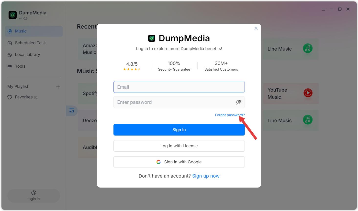 オプション1: 起動 DumpMedia左下にある「ログイン」ボタンまたはプロフィールアイコンをクリックしてください。購入時に使用したメールアドレスとライセンスキーを入力してください。「サインイン」をクリックして登録を完了してください。アクティベーション後、曲を数量制限なしでダウンロードできます。