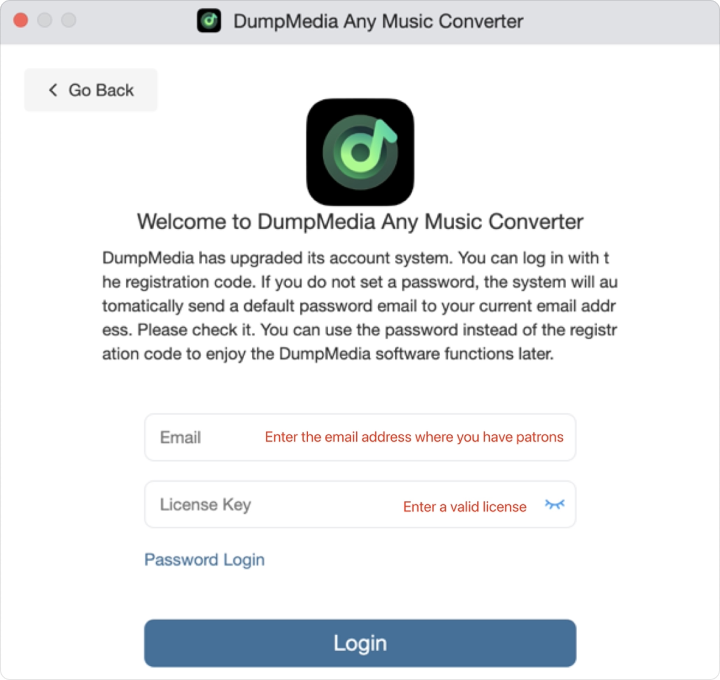 注: ライセンスキーを受け取っていない場合は、メールアドレスとパスワードを使用して直接アカウントをアクティブ化してみてください。それでもアクティブ化できない場合は、 support@dumpmedia.com までメールを送るか、フィードバックをお送りください。