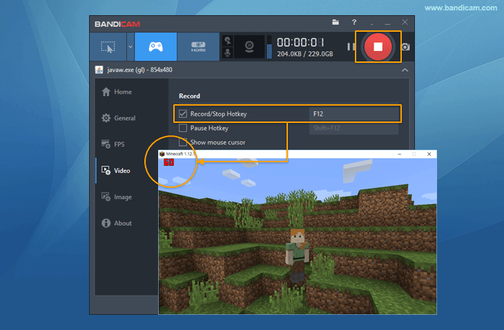 5ステップ。 を押しF12 キーボードで、またはBandicamのインターフェースで赤いRecサークルボタンをクリックして、録音プロセスを開始します。 録画が開始されると、緑のFPS番号が赤に変わります。
